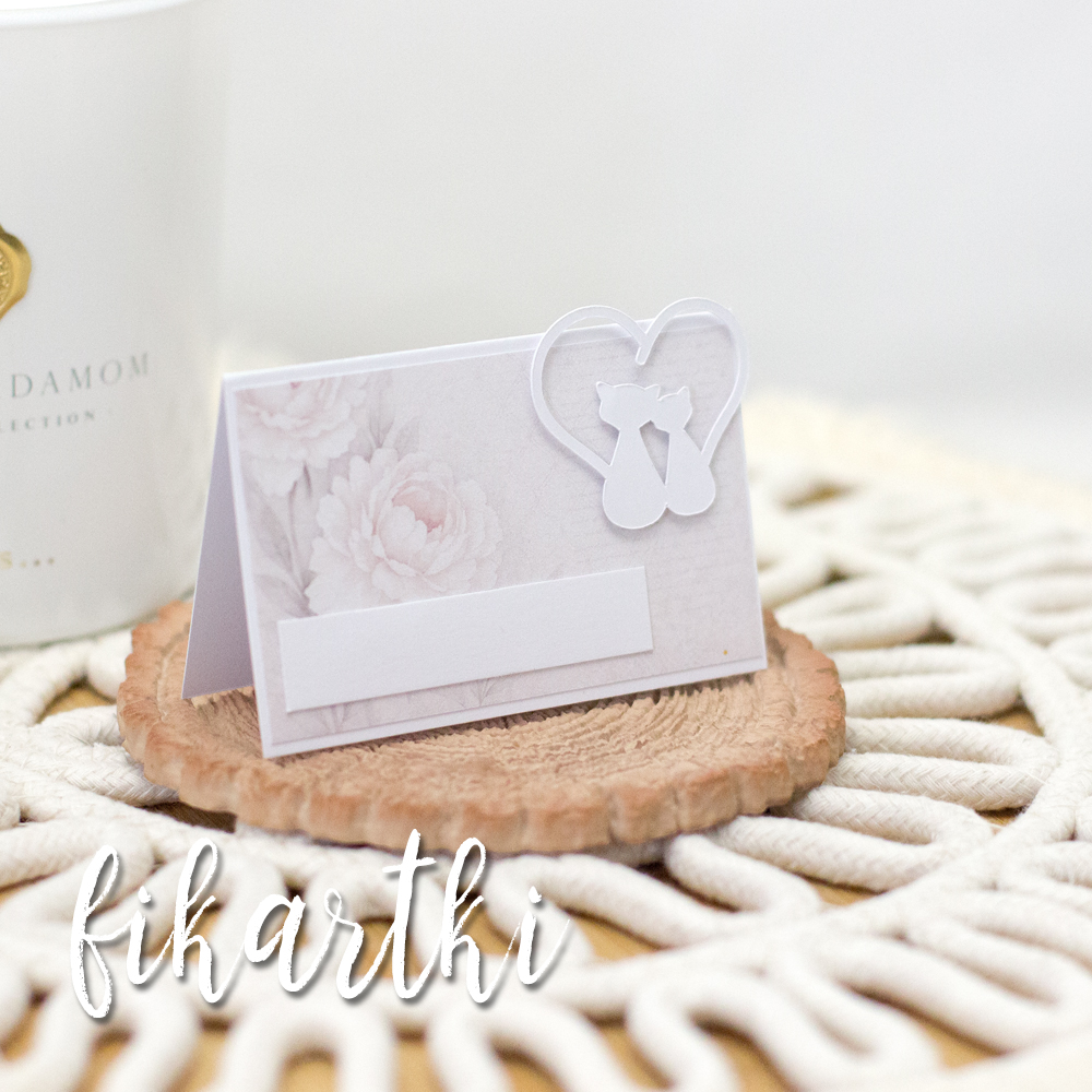 Ręcznie robione winietki ślubne z uroczym motywem kotów w sercu. Idealne do personalizacji, sprzedawane w zestawach po 5 szt. Dodaj magii swojemu weselu!