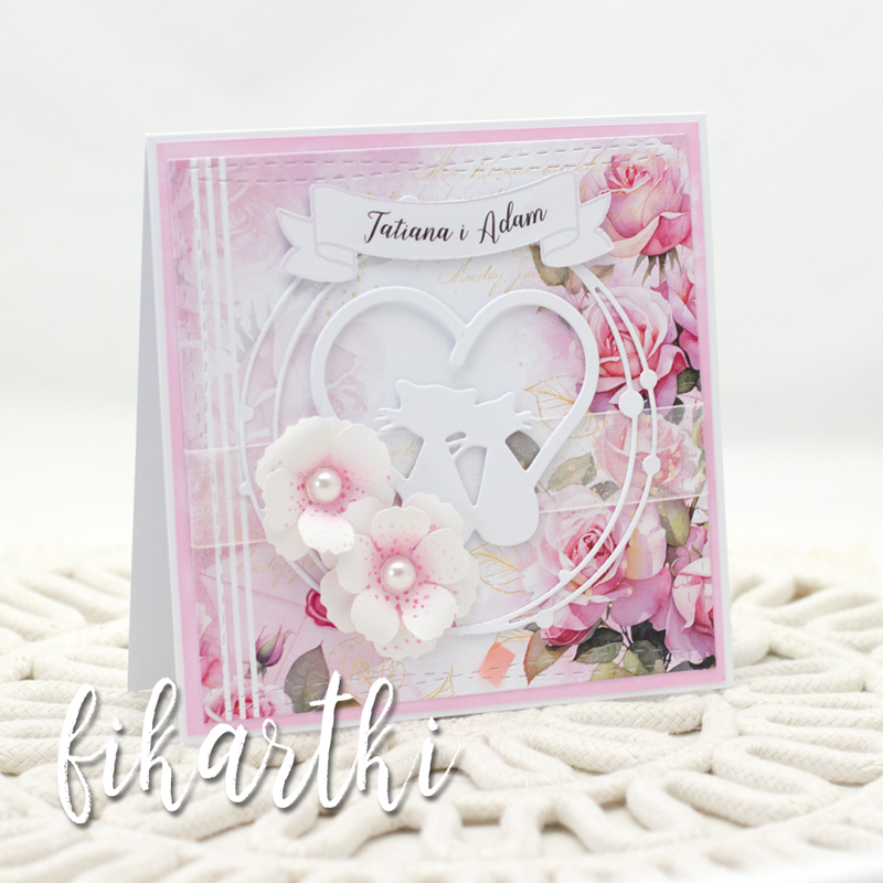 To wyjątkowe, kwadratowe zaproszenie ślubne (13,5 cm x 13,5 cm) jest subtelną zapowiedzią Waszego wielkiego dnia. Zaproszenie jest ręcznie robione z sercem i pasją, z miłości do papieru i tworzenia, co czyni je niepowtarzalną pamiątką. Delikatne połączenie romantycznych róż w odcieniach pudrowego różu i bieli, wydrukowanych na wysokiej jakości papierze, oraz uroczy motyw zakochanych kotów nadaje mu niepowtarzalnego charakteru.